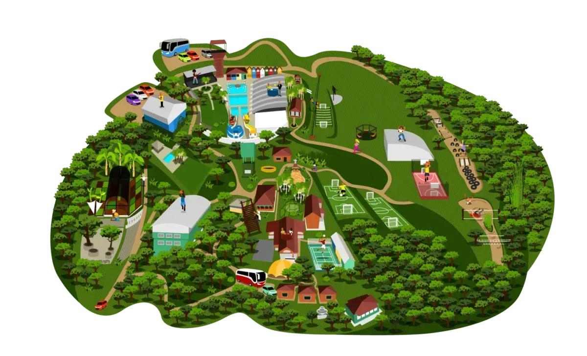 O acampamento possui 260 mil m² com campos, quadras, ginásio, teatro, trilhas, parques aquáticos, tirolesa, escalada, lago, circuito de aventura, brinquedoteca, salão de jogos e muito mais.